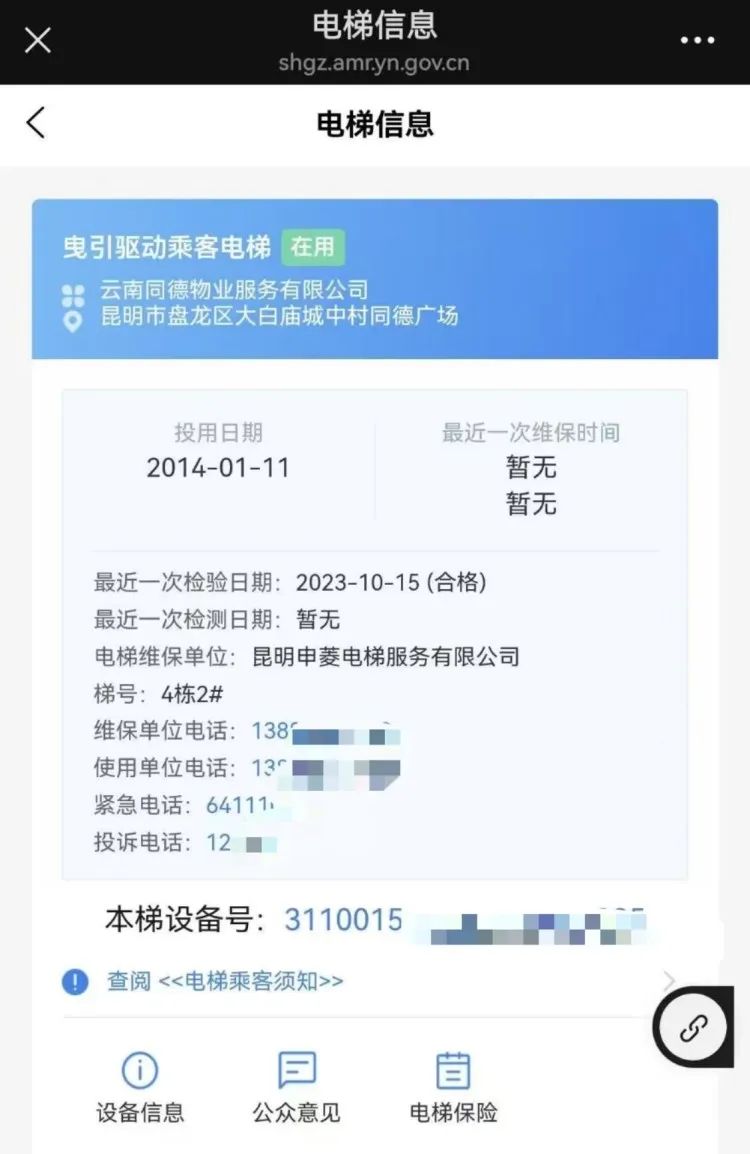 通过扫描4栋2号电梯内放置的“云南省市场监管电梯社会共治平台”二维码显示:电梯于2014年1月11日投入使用,电梯维保单位为昆明申菱电梯服务有限公司,最近一次维保时间“暂无”、最近一次检验日期为2023年10月15日,制造单位系奥的斯电梯(中国)有限公司。1号电梯则显示最近一次检测时间为2023年10月15日,最近一次维保时间为2024年9月20日。