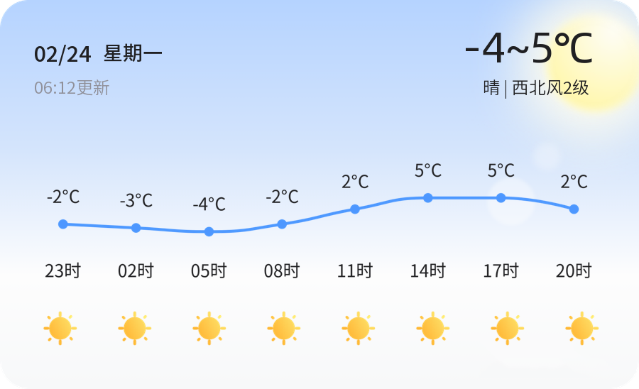 2025年2月24日,农历正月廿七,临沂迎来了晴朗的一天,但气温较低,早晨最低气温达到-4℃,白天最高气温也仅有5℃,伴有西北风2级,空气湿度为41%,空气质量良好,PM2.5浓度为67微克/立方米,属于二级良水平,适宜开窗通风,但早晚温差大,市民出行需注意防寒保暖,建议穿着厚外套,佩戴围巾手套。