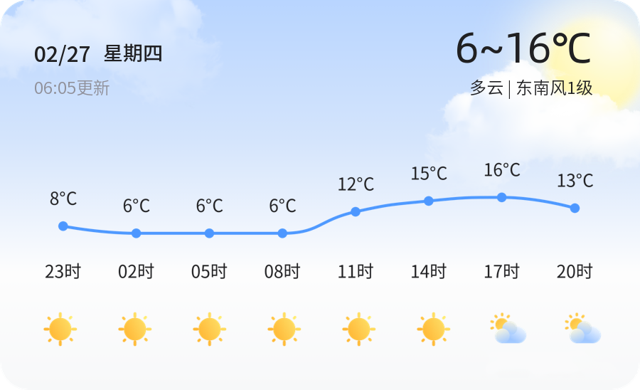 2025年2月27日,农历正月三十,济宁市区今日天气为多云,气温范围在6℃至16℃之间,东南风1级,空气湿度60%,空气质量PM2.5指数为119,整体天气较为宜人。全市各区天气情况大致相同,均以多云天气为主,适宜市民外出活动。