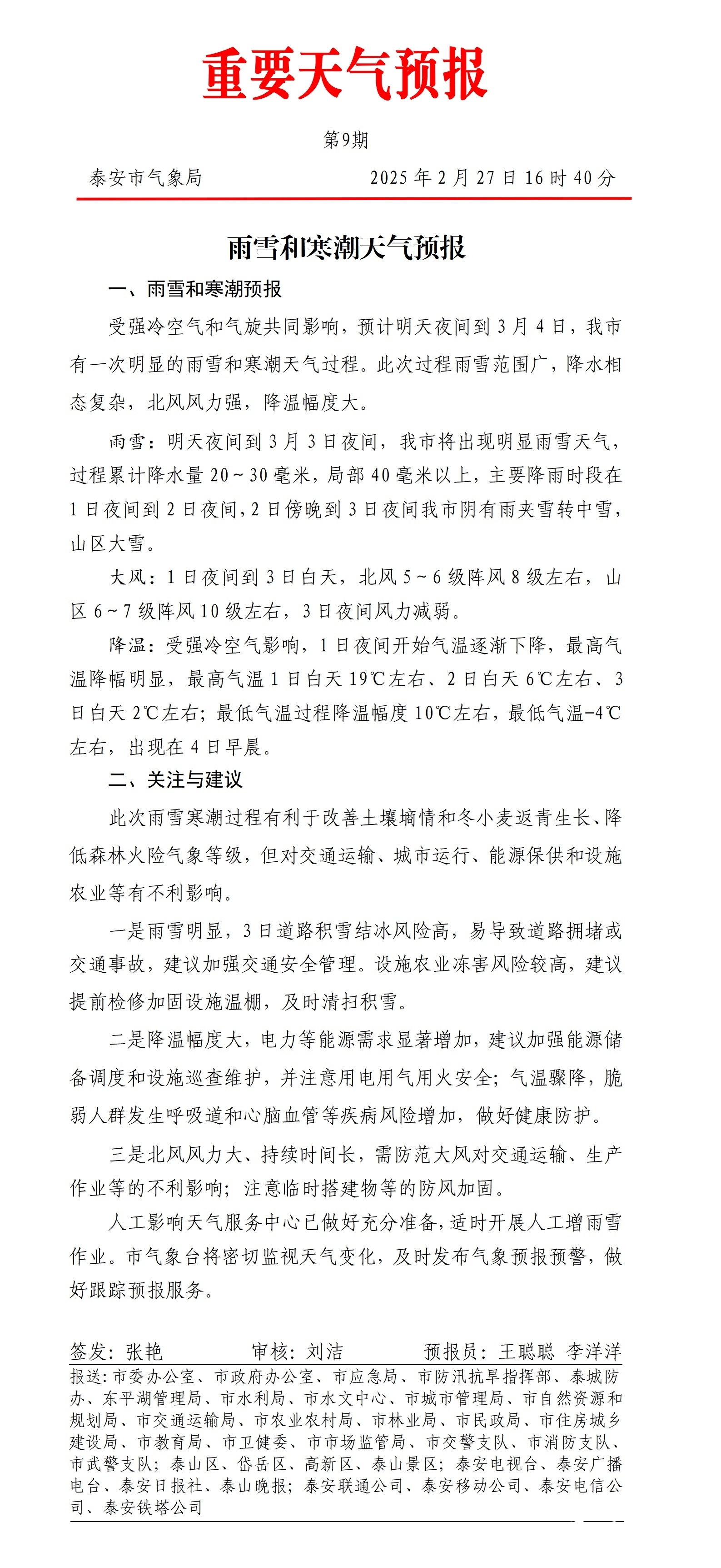 2月27日,泰安市气象局发布雨雪和寒潮天气预报: