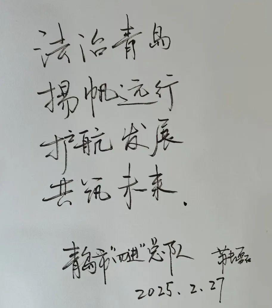 省派驻青岛市“四进”工作总队一行实地调研了青岛中央法务区公共法律服务中心、青岛国际商事法庭、青岛知识产权法庭、涉外法务区共享空间。在涉外公共法律服务大厅,听取了“一站式”涉外法律服务和公共法律服务场景介绍,深度感受全链条、全要素法律服务便民利企实效;与“青法先生”法律服务AI数智人互动交流,沉浸式体验法务数字化、智能化转型升级。在青岛国际商事法庭展厅和审判区,与法官围绕公正高效审理涉外商事案件,维护国际经贸秩序进行探讨,对青岛国际商事法庭构建国际商事争端解决优选地,护航高水平对外开放给予了充分肯定。在青岛知识产权普法基地,深入了解了知识产权审判在维护公平竞争、激励创新创造,为新质生产力发展提供司法保障方面的重要作用。在涉外法务区共享空间,参观了开放共享活动区、共享国际会议服务区、法务书吧等共享场景,观看了青岛中央法务区宣传片,对中央法务区构建资源共享、协同发展的良好生态高度赞扬。调研期间,省派驻青岛市“四进”工作总队负责人,山东省财欣资产运营有限公司党委委员、副总经理苏长磊以“法治青岛 扬帆远行 护航发展 共筑未来”寄语青岛中央法务区。