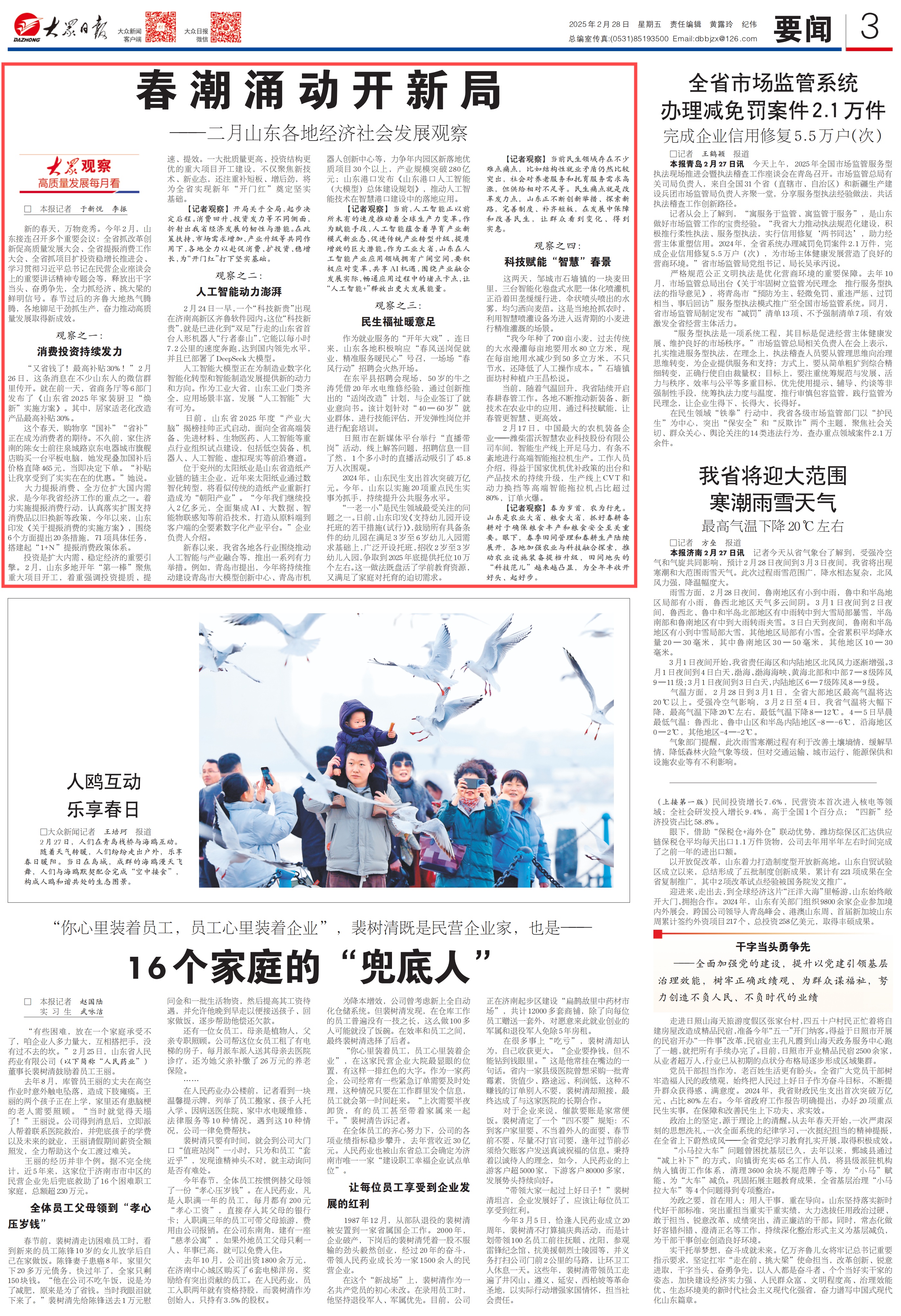 2月28日,3版要闻刊发《春潮涌动开新局》,报道,在东平县招聘会现场,50岁的牛之涛凭借20年水电维修经验,通过创新推出的“适岗改造”计划,与企业签订了就业意向书。详情点击这里——《春潮涌动开新局》