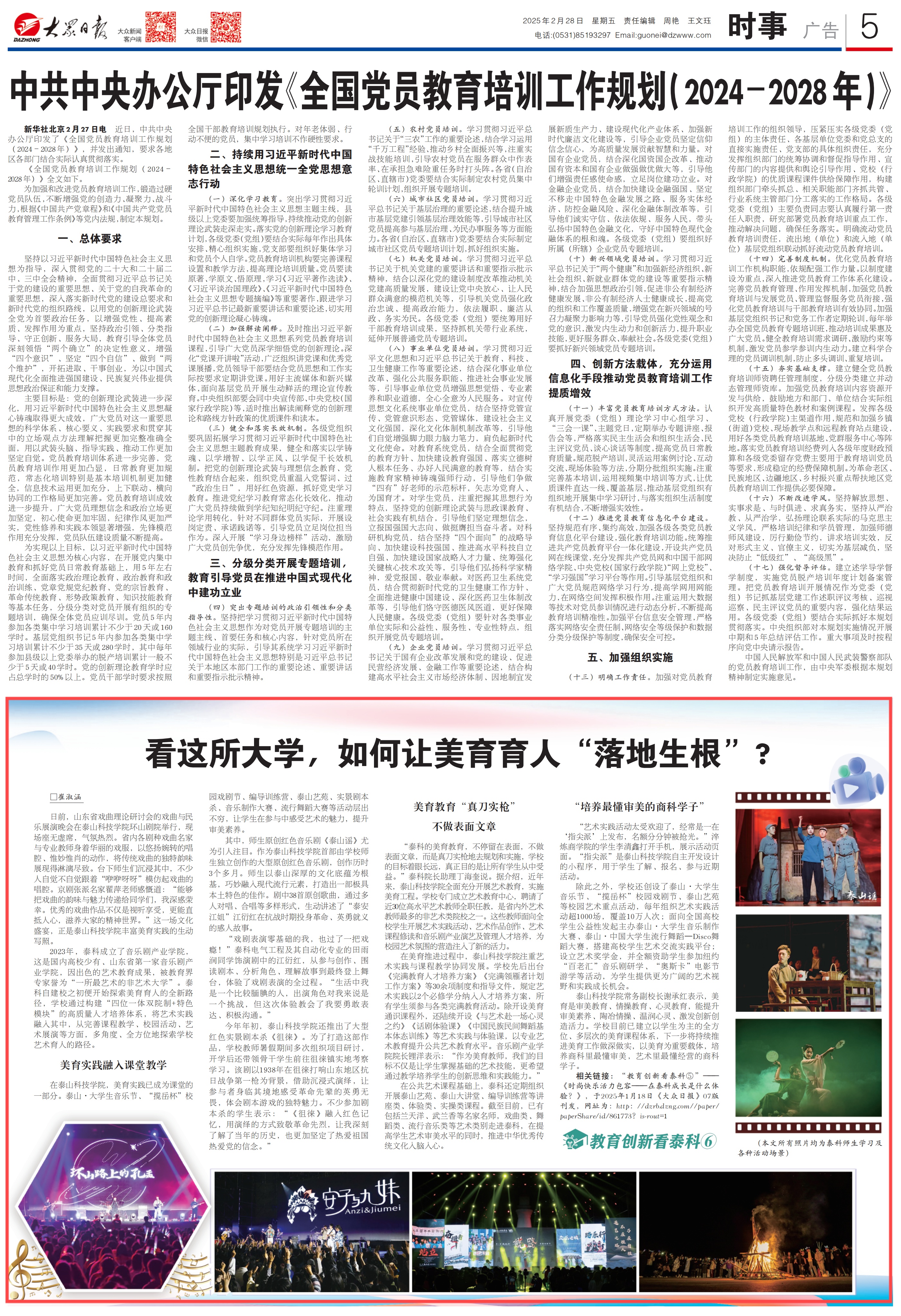 2月28日,5版刊发《看这所大学,如何让美育育人“落地生根”?》,报道泰山科技学院自建校之初便开始探索美育育人的全新路径,学校通过构建“四位一体双院制+特色模块”的高质量人才培养体系,将艺术实践融入其中,从完善课程教学、校园活动、艺术展演等方面,多角度、全方位地探索学校艺术育人的路径。详情点击这里——《看这所大学,如何让美育育人“落地生根”?》