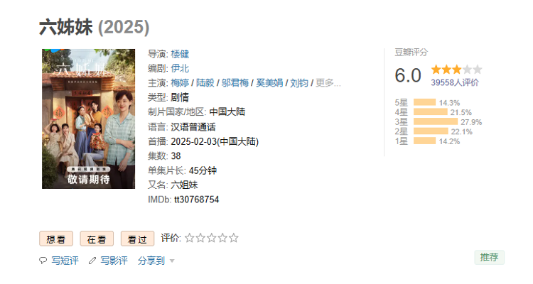 年代剧《六姊妹》在一片争议声中落下帷幕,高收视率与低评分形成鲜明对比。这部剧在首播当日便斩获全国收视冠军,是首部CVB收视单日破5的剧集。但其豆瓣评分却从6.3跌至6.0,口碑出现两极分化,这部聚焦女性成长、展现时代变迁的剧集,为何会陷入”叫座不叫好”的怪圈?