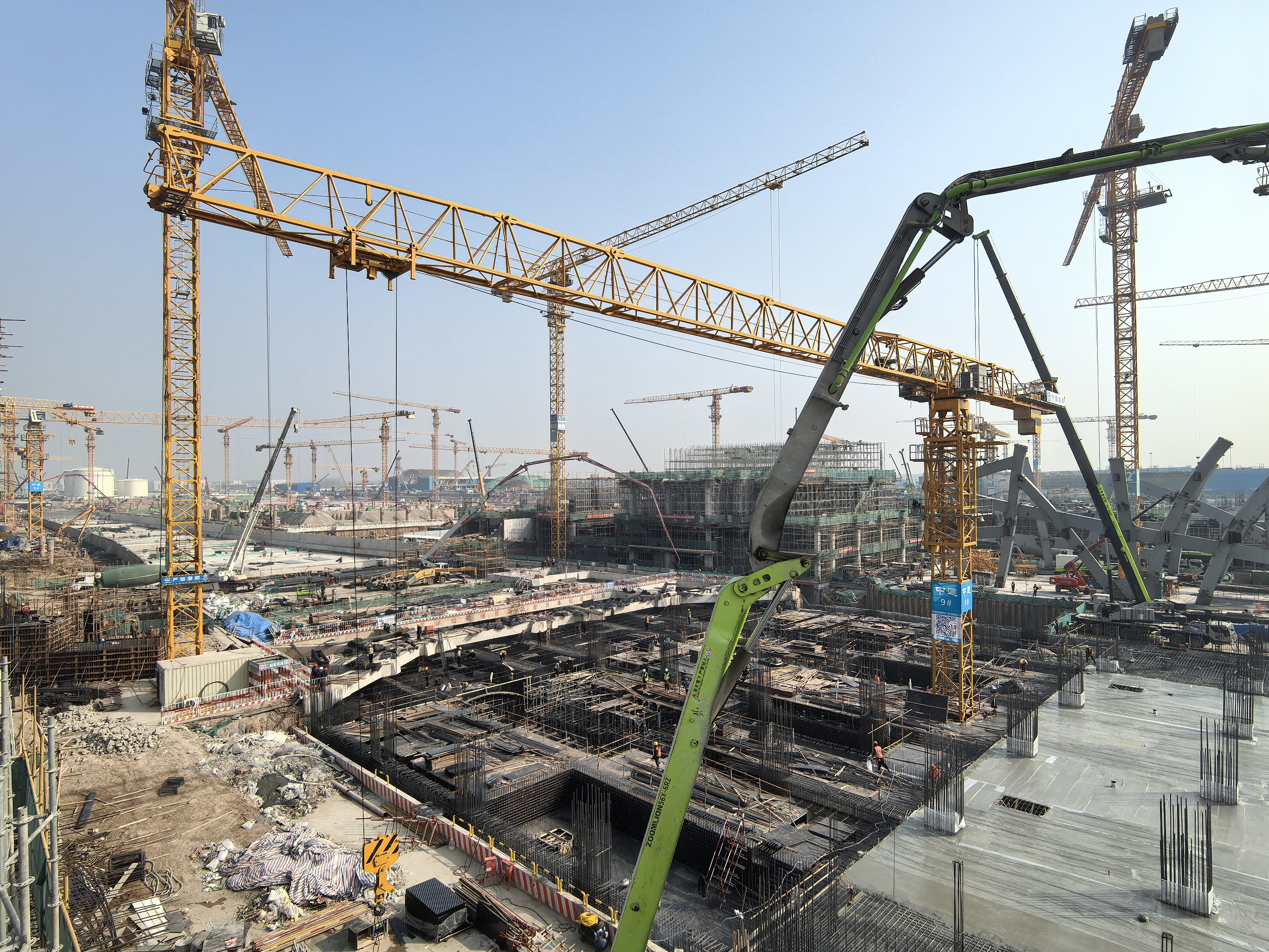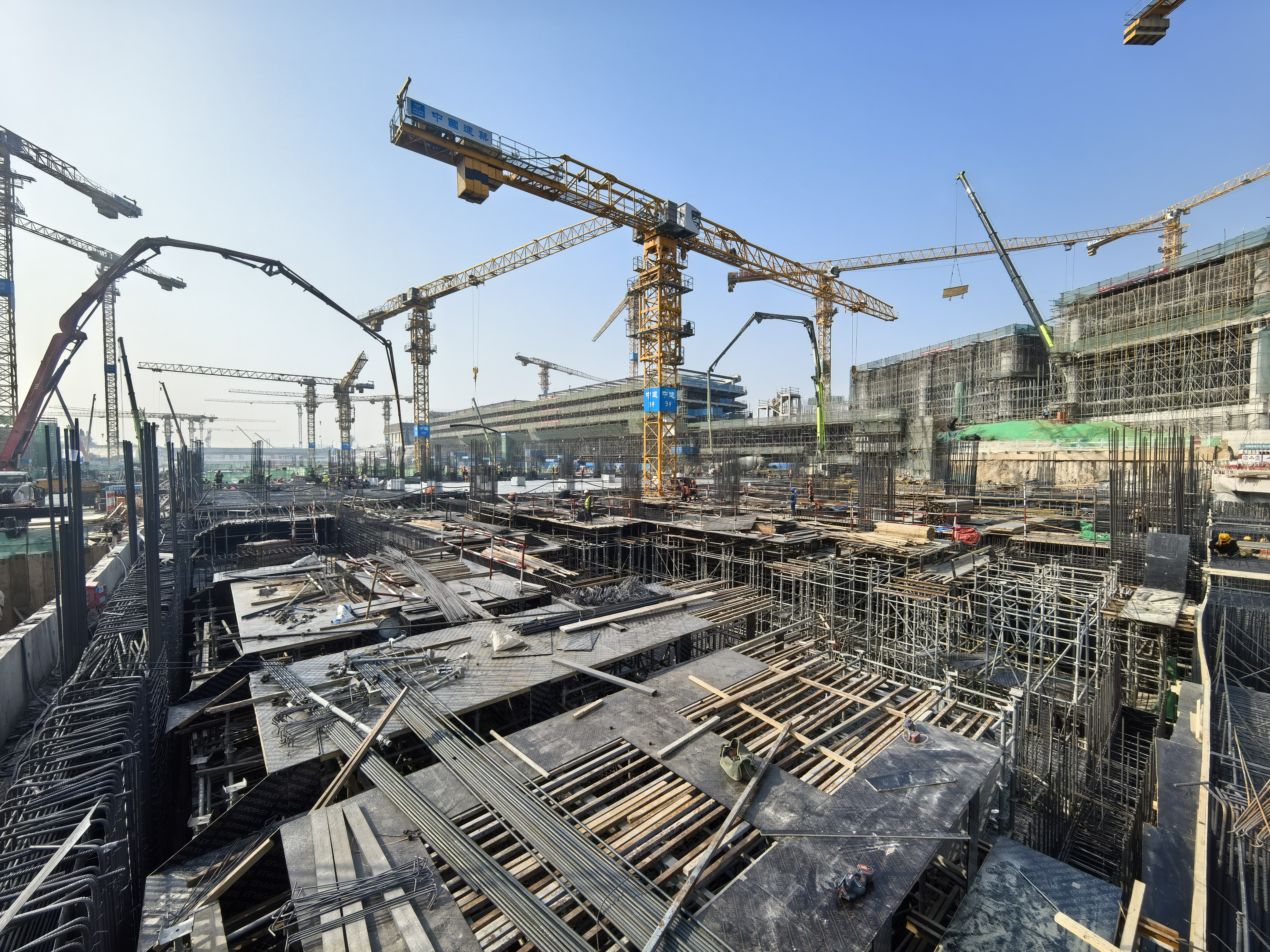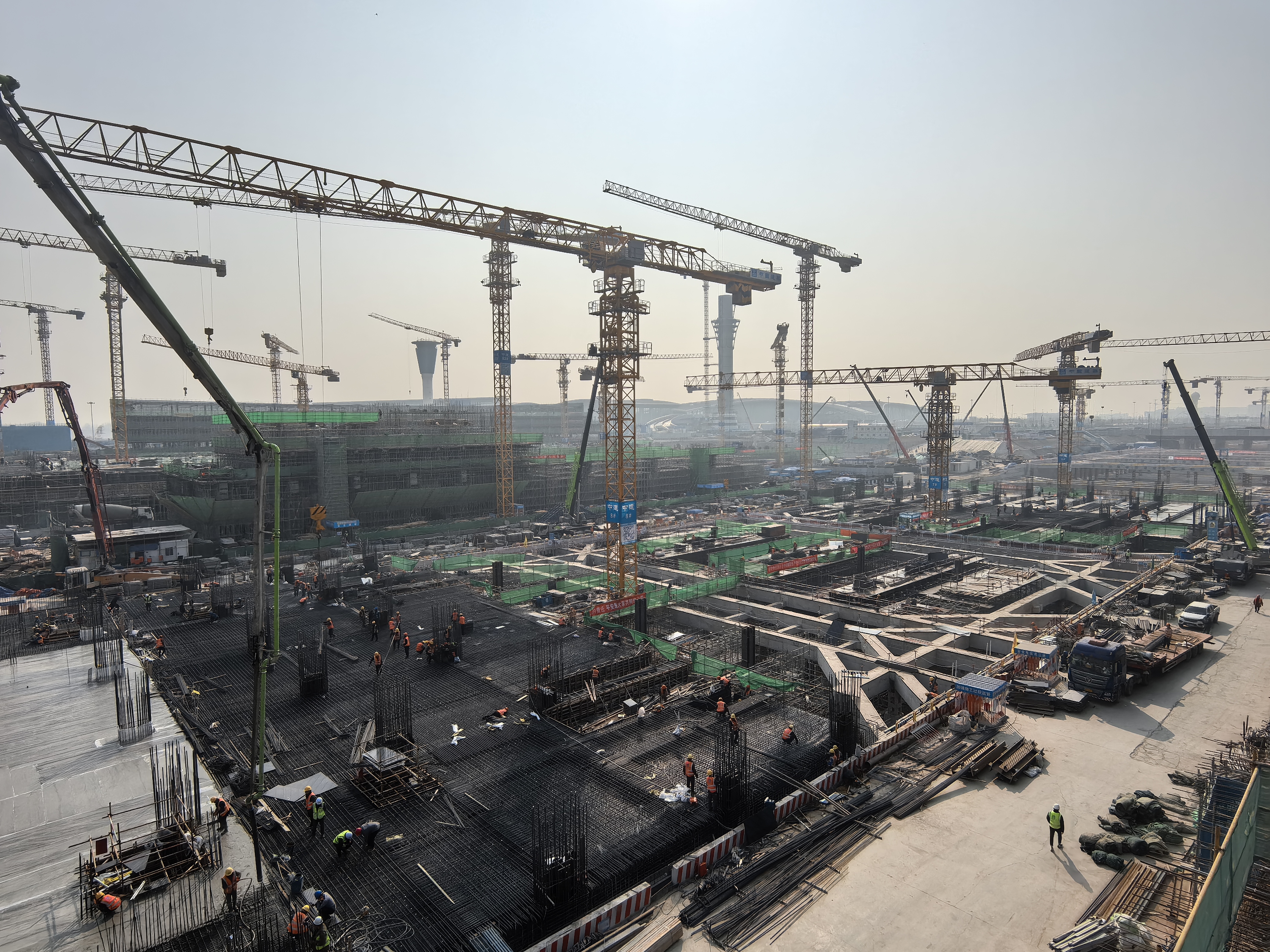 在遥墙机场站站房施工现场,工人们正在进行机场站主体结构施工。目前,主体结构已完成45%,预计3月底完成首块顶板施工,预计5月底完成全部主体结构施工。