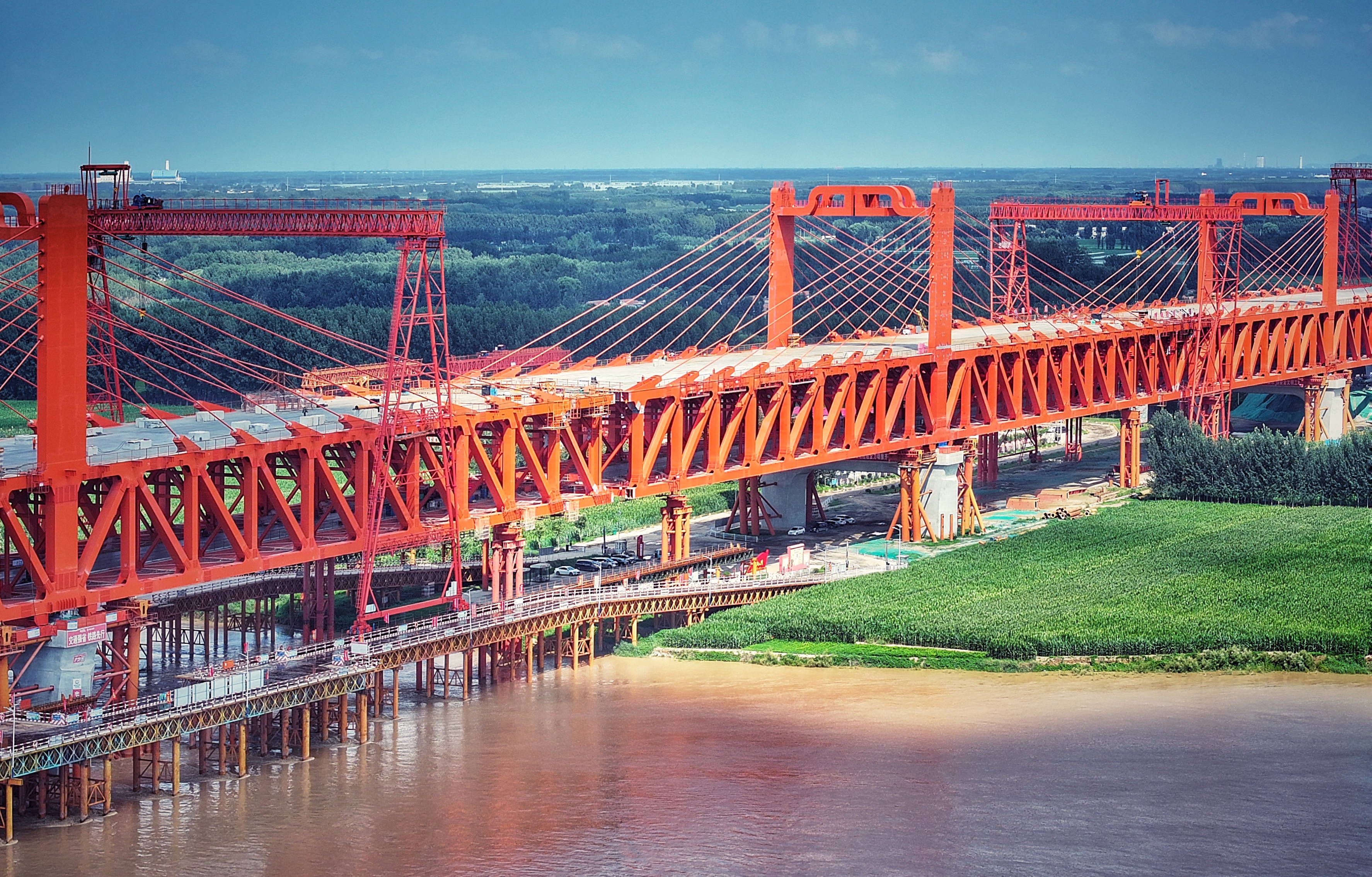 在距离8公里处的济阳黄河公铁两用特大桥施工现场,记者看到大桥横跨黄河南北两岸,该特大桥主桥是目前世界上跨度最大的塔梁固结、塔墩分离体系公铁合建桥梁,也是世界上跨度最大的多塔多跨、非对称矮塔钢桁梁斜拉桥。目前,该桥的主桥主体工程全部完工,大桥实现贯通。工人正在紧锣密鼓地进行桥面系剪力钉、挡砟墙、钢梁检查车轨道安装等施工,预计这些工作将在6月底前全部完成。