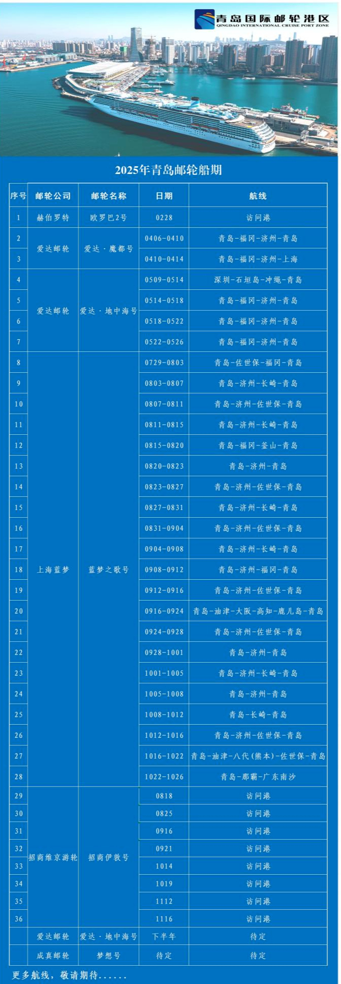 据悉,2025年青岛邮轮母港将迎来50余艘次邮轮到港,访问港邮轮艘次有望创历史新高。