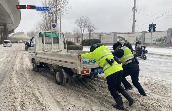 此外,在本次暴雪应对中,交警们采取多项措施,对过于湿滑的路段,使用警戒带临时封路;遇到车辆在路口打滑或故障,及时帮助市民发动车辆,避免影响交通。考虑到部分市民尤其是老人出行未预料到降雪,女警们在路口协助市民安全通过。