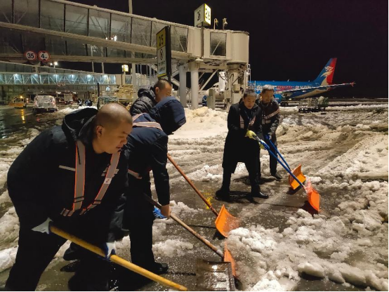 为确保旅客上下机安全,地服部工作人员及时对飞机与廊桥接缝处的积雪进行清理,做到随下随扫,并铺设防滑地毯,以避免旅客滑倒摔伤,用温暖和关爱为旅客驱散焦虑和不安。