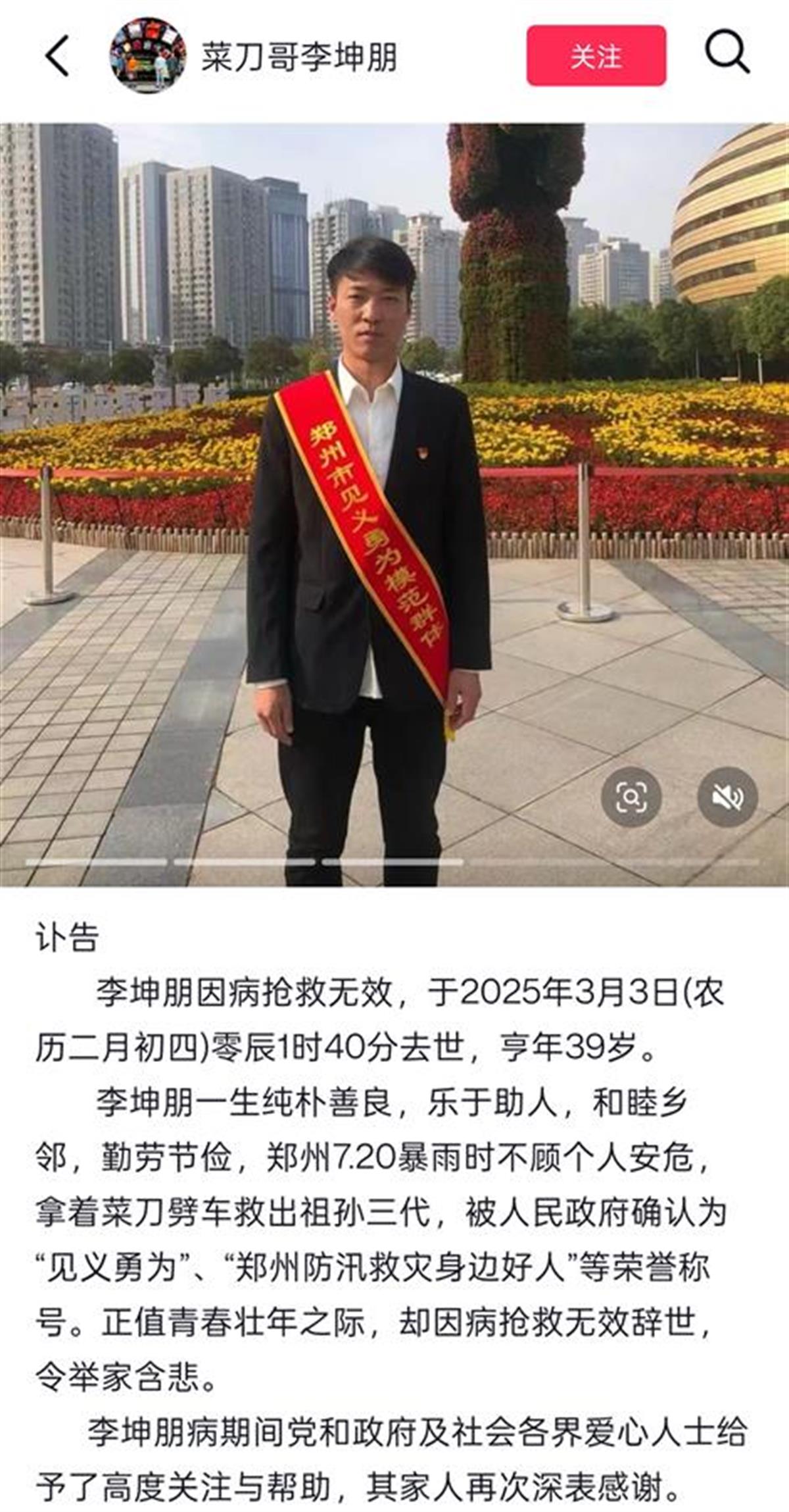 “菜刀哥”李坤朋突发疾病去世,年仅39岁,曾在郑州暴雨期间连救三人,获“见义勇为”称号