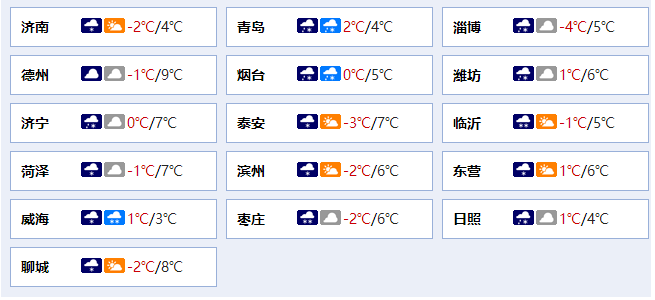 最低气温:鲁西北和鲁中山区-4℃左右,沿海地区1℃左右,其他地区-2℃左右。