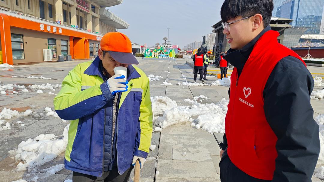 志愿者们工作时,发现济南西站东广场有工人正在清理降雪后的积冰积雪。服务队立即行动,组织队员将精心熬制的红糖姜水送到户外作业的工人手中。“师傅们辛苦了!喝口热姜水暖暖身子。”志愿者们穿梭在寒风中,为每位工人递上热气腾腾的姜茶。正在铲除积雪的师傅接过杯子后感慨:“这姜水喝下去,从胃里暖到心里,太感谢你们了!”