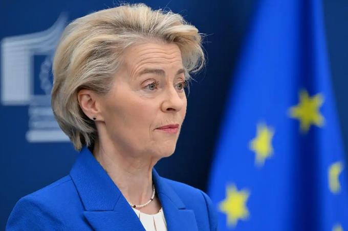 3月4日,在比利时布鲁塞尔,欧盟委员会主席冯德莱恩出席新闻发布会。新华社/法新