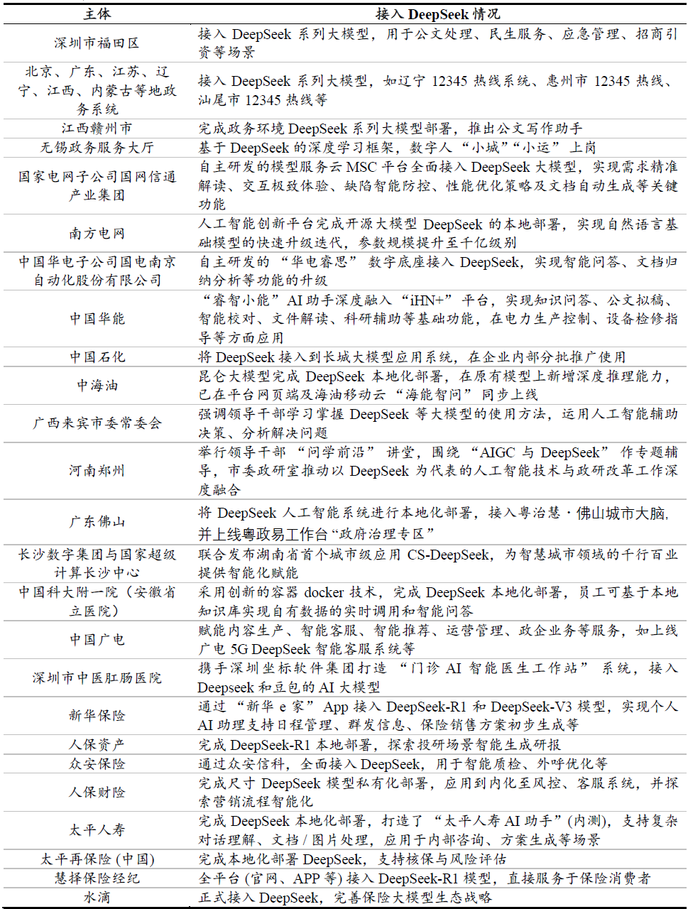 需要注意的是,在一体机密集发布的背后,是党政机关和关键行业客户引入DeepSeek的需求井喷。近期以来,北京、广州等多地政务系统宣布全面启用DeepSeek大模型,首批AI“公务员”正式上岗,覆盖文件处理、政策咨询等场景。与此同时,相关数据显示,有超20家央企已接入DeepSeek,涉及能源、通信、汽车、金融、建筑等多个领域。