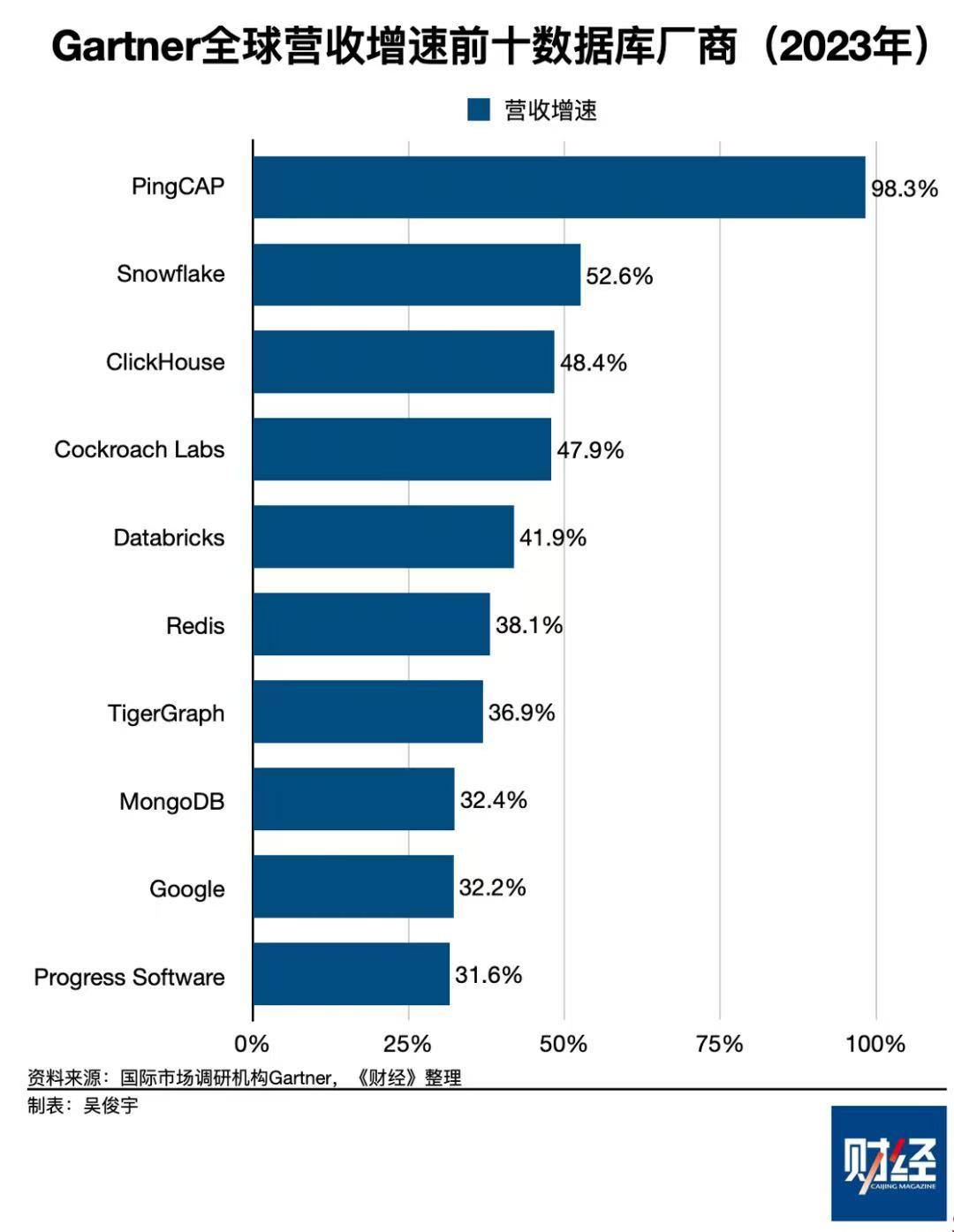 Gartner还统计了2023年全球营收增速最快的十家数据库厂商。其中营收增速前三强分别是中国数据库创业公司PingCAP、美国明星数据分析公司Snowflake、俄罗斯IT公司Yandex旗下的ClickHouse。其中,PingCAP是一家开源数据库公司,成立于2015年,主打产品是TiDB,客户覆盖中国、北美、日本等国家或地区。不过,Gartner没有披露上述厂商的营收信息。