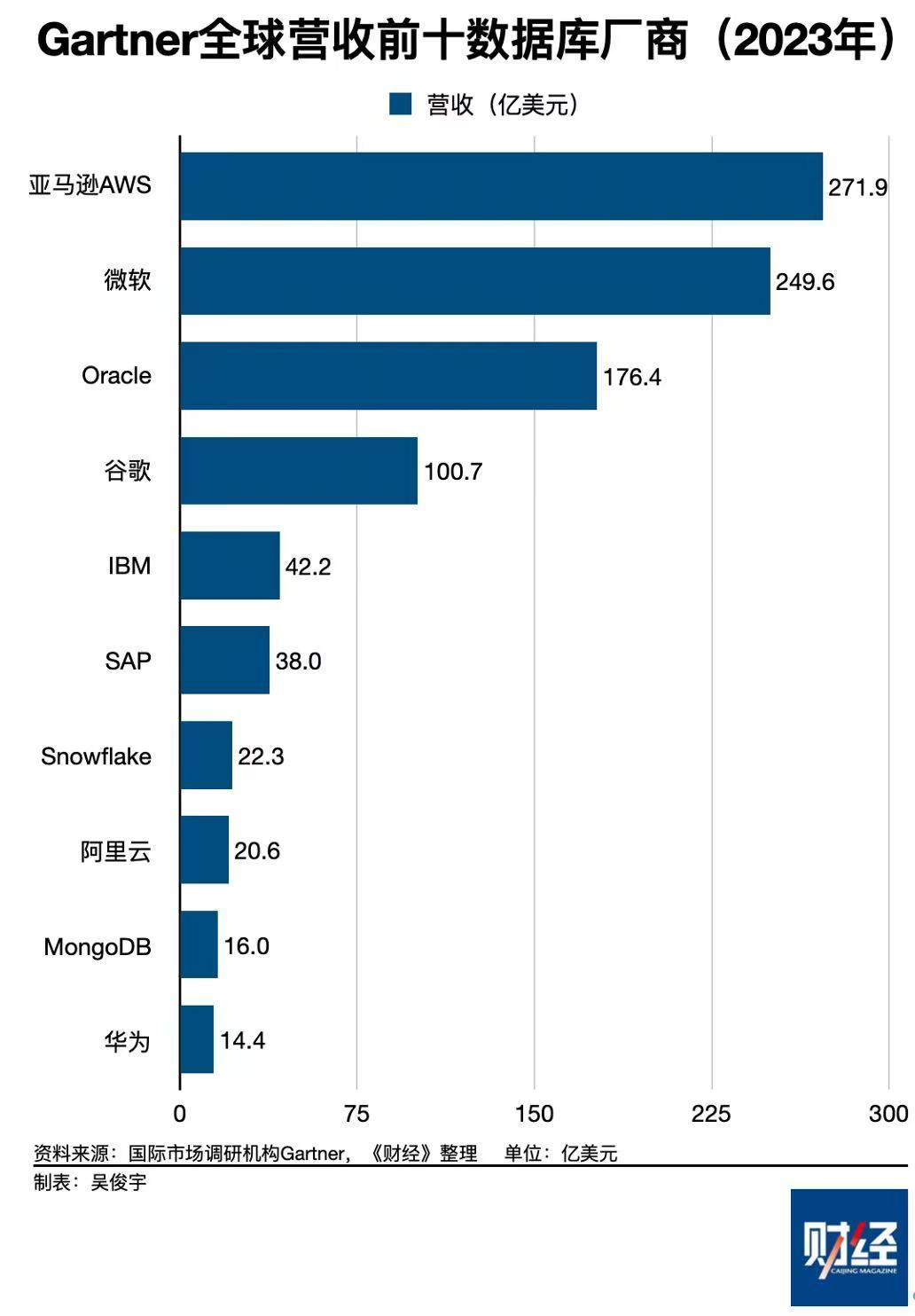 目前,全球数据库市场仍然是国际软件公司占据主导地位。全球市场规模前十的数据库厂商分别是:亚马逊AWS 271.88亿美元、微软249.58亿美元、Oracle 176.39亿美元、谷歌100.7亿美元、IBM 42.2亿美元、SAP 38.4亿美元、Snowflake 22.32亿美元、阿里云 20.58亿美元、MongoDB 15.85亿美元、华为14.4亿美元。
