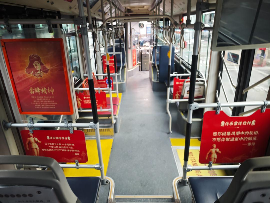 作为济南首条“雷锋精神”主题专线,B52路车厢内外焕然一新:车体喷涂鲜红的雷锋头像与线路名称,车厢内部装饰以雷锋画像、名言,营造沉浸式体验。车厢内还打造了“雷锋便民箱”,急救包、爱心雨伞等便民物资一应俱全,为乘客提供便利;便民箱还设有雷锋精神宣传角,摆放着雷锋杂志及企业相关资料等读物供乘客取阅。更值得一提的是,车厢内还放置了结合车厢环境制定的雷锋主题车厢文明公约,不仅要求驾驶员带头履行,还倡导乘客共同参与,将驾驶员服务承诺与乘客文明守则可视化呈现,构建流动的文明实践阵地。