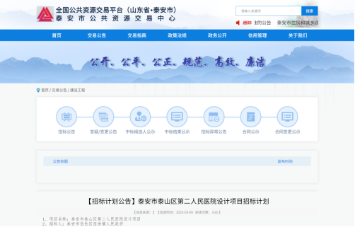 3月4日,泰安市公共资源交易中心发布泰安市泰山区第二人民医院设计项目招标计划公告: