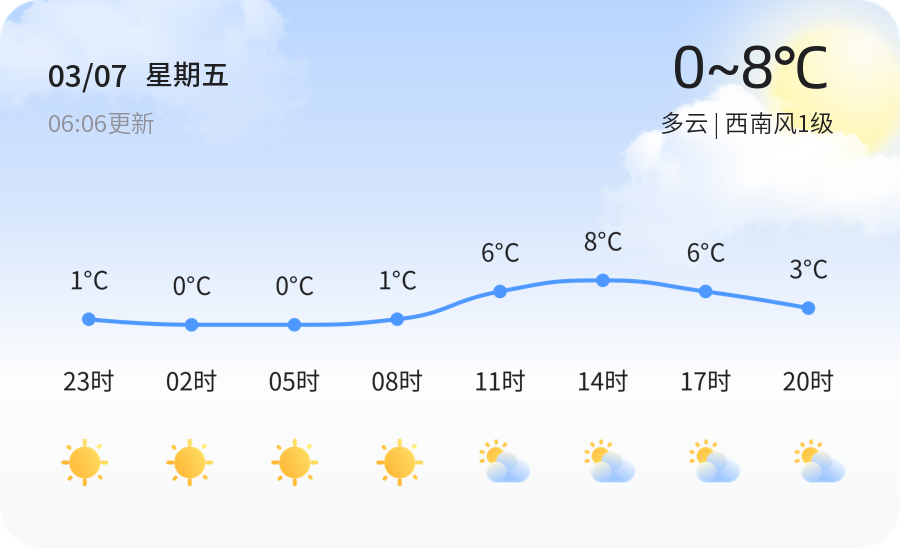 【今日天气】今天是2025年3月7日,农历二月初八,烟台天气以多云为主,气温在0℃至8℃之间,西南风1级,空气湿度71%,空气质量状况为优(PM2.5浓度为41微克/立方米)。多云天气下,昼夜温差较大,市民出行请注意适时增减衣物,防寒保暖。同时,空气质量优良,适宜户外活动,但早晚气温较低,建议老人和儿童减少外出,避免感冒。