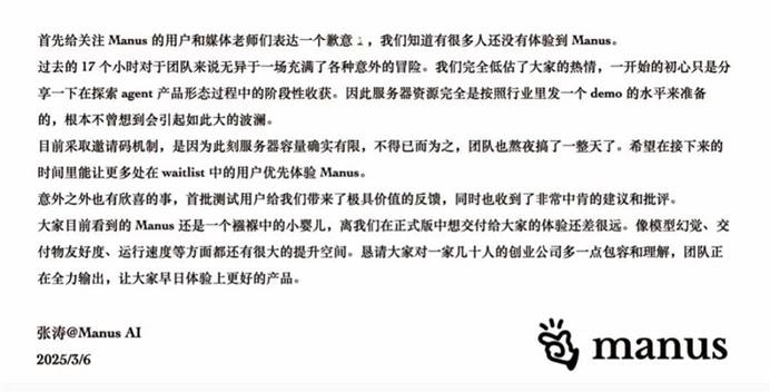 公告还提到:首批测试用户给团队带来了极具价值的反馈,同时也收到了非常中肯的建议和批评。大家目前看到的Manus还是一个襁褓中的小婴儿,离我们在正式版中想交付给大家的体验还差很远。像模型幻觉、交付物友好度、运行速度等方面都还有很大的提升空间。恳请大家对一家几十人的创业公司多一点包容和理解,团队正在全力输出,让大家早日体验上更好的产品。