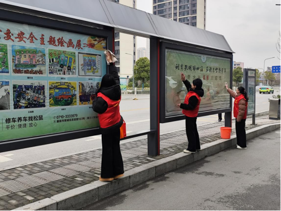 (阳光人寿襄阳中支志愿者擦拭广告灯箱、摆放共享单车)