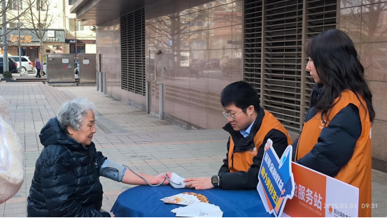 (阳光人寿大连分公司为老人测量血压、进行金融知识宣传)