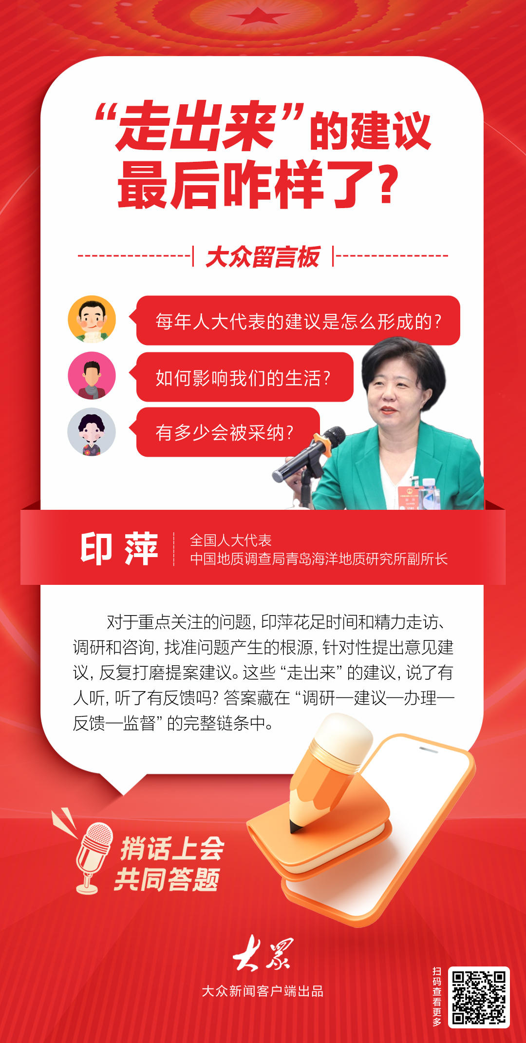 这一串串数字,就是一份份沉甸甸的民意。对此,青岛海洋地质研究所副所长印萍代表深有感触。
