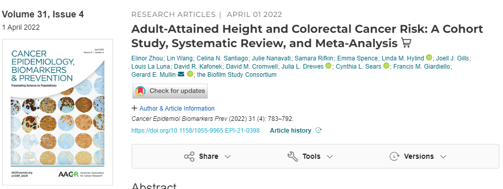 2022年3月,约翰·霍普金斯大学的研究人员在《癌流行病学、生物标记与预防》上发表了一项研究表明,高个子的人可能比矮个子的人更容易患上结直肠癌或结肠息肉,而这些息肉后来可能会变成恶性肿瘤。身高每增加10厘米患结直肠癌的风险增加14%,患腺瘤的风险增加6%。