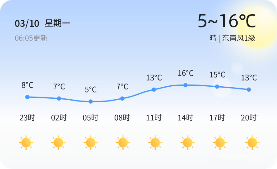 今天是2025年3月10日,农历二月十一,济宁天气晴朗,气温在5℃至16℃之间,东南风1级,空气湿度74%,但空气质量因PM2.5达到120而处于轻度污染状态,敏感人群需适当防护。建议市民朋友在晴朗的天气里多进行户外活动,享受阳光,但请佩戴口罩,减少户外运动时间,注意健康。