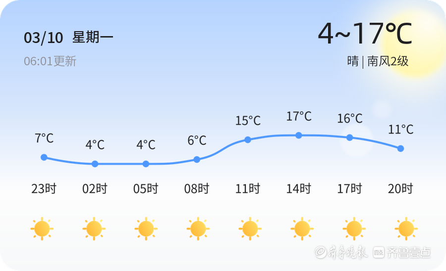 今天是2025年3月10日,农历二月十一,淄博的天气以晴朗为主,气温在4℃到17℃之间,南风2级,空气湿度63%,空气质量稍差,PM2.5指数为113。淄博各区普遍晴朗,阳光明媚,适合市民外出活动。