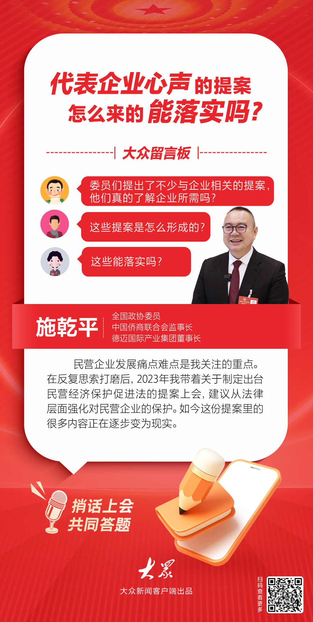 “我是一名全国政协委员,我也是一名企业负责人。委员履职不只在参会的几天时间里,全年都需要观察、调研和思考。”中国侨商联合会监事长、德迈国际产业集团董事长施乾平委员告诉大众新闻记者。