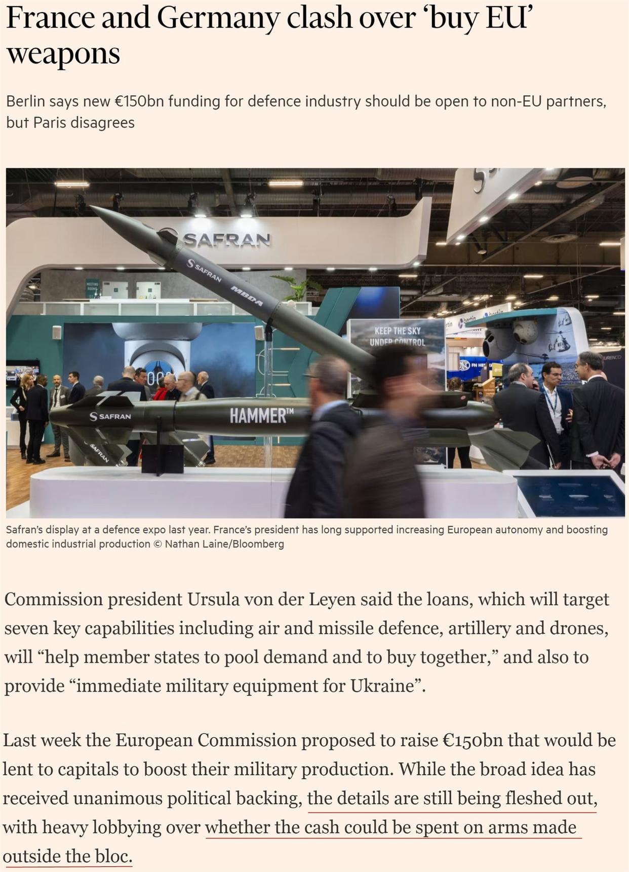 与此同时,对于这些资金能否用于购买非欧盟国家生产的武器装备,各方存在分歧,特别是作为欧盟“双发动机”的法国和德国更是争执激烈。