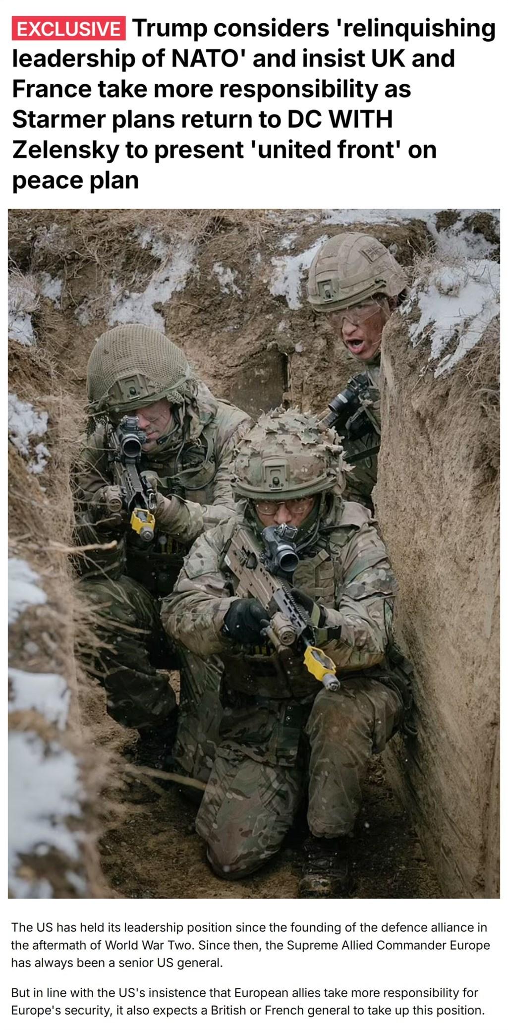 北约自成立之日起一直由美国主导,其重要标志就是,北约最高级别军事指挥官——欧洲盟军最高司令一直由美国将领担任。但据英国《每日邮报》日前独家披露,特朗普坚持要求欧洲盟友对欧洲安全承担更多责任,因此他希望由英国或法国将领担任北约欧洲盟军最高司令。