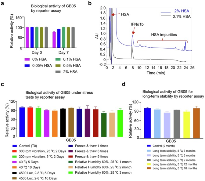 传统干扰素制剂存在易形成二聚体、HSA(人血清白蛋白,Human Serum Albumin)含量较高引起免疫原性风险等核心痛点,GB05经过双重改良创新突破、解决痛点。野生型IFNα1b在雾化过程中形成聚体风险较高,GB05通过引入C86S突变来防止分子间二硫键错配形成二聚体,有助于增强GB05的安全性,尤其是对儿童患者。同时,GB05的制剂配方也进行了优化:在保持生物学活性的同时最大化降低HSA含量(图1a)。随着HSA浓度的降低(从2%到0.1%),GB05中HSA引入的杂质相应减少(图1b),提升了产品纯度,降低雾化吸入时因杂质在呼吸道残留引起的免疫原性风险,提高对婴幼儿患者的安全性。荧光素酶报告基因检测结果显示,在不同温度、光照、湿度等多种实验条件下,含0.1%HSA的GB05活性没有明显变化(图1c)。在长期稳定性测试中,GB05活性在18个月内保持不变(图1d)。