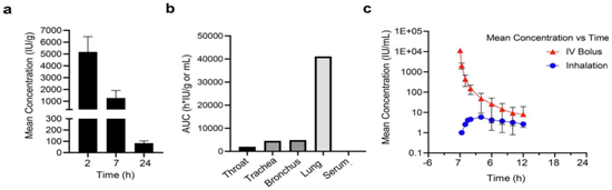 在体内抗RSV感染的实验中,GB05的安全性表现也十分出色。GB05在食蟹猴体内单次吸入后的药代动力学特征显示,相比IFNα1b注射给药,雾化吸入GB05后药物系统暴露较低。吸入给药后药物主要沉积在呼吸道尤其是肺部发挥作用(图2),表明GB05具备较好的安全性和潜在药效。
