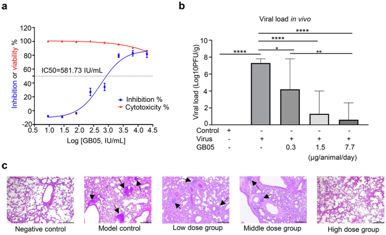 体内外药效实验进一步验证GB05对RSV感染表现出有效的抗病毒活性。体外病毒抑制率IC50为581.73 IU/mL(图3a)。体内小鼠抗病毒实验显示,给药后小鼠肺部病毒载量显著降低,肺部病理切片染色显示给药后病灶炎症显著缓解(图3b、3c)。此外,食蟹猴肺和支气管肺泡灌洗液浓度显著高于体外抗病毒IC50,表明GB05雾化后能达到肺内有效治疗水平。更重要的是,从临床Ib期研究数据来看,在目标治疗剂量下,支气管肺泡灌洗液中的药物浓度(210,000IU/mL)也远高于体外抗病毒IC50浓度,进一步验证GB05的体内抗病毒作用。