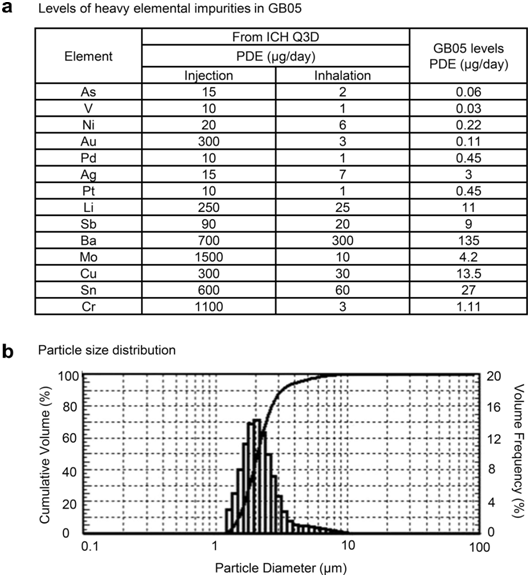 由于RSV相关LRTI的病变部位位于下呼吸道和肺部,因此通过雾化输送小颗粒(1-5μm)气雾剂形式的药物将具备更大优势,尤其是对于儿童,药物直接作用、见效快、不良反应少、依从性好。GB05的平均雾化粒径为2.321μm(图4a),符合FDA和ICH吸入药物指南。最后,GB05检测到的所有重金属均低于ICH限值(图4b)。重金属杂质对部分人体器官存在潜在危害,可能引起婴幼儿轻度上呼吸道刺激。例如,过量吸入钼(Mo)与肺纤维化、肺炎等肺组织损伤有关;吸入铬(Cr)可能会对支气管上皮细胞产生不利影响;铜(Cu)的积累已被证明会导致线粒体蛋白的突变和聚集。因此,GB05较低的重金属含量对儿童用药来讲,更安全,更大限度降低与重金属有关的潜在健康风险。
