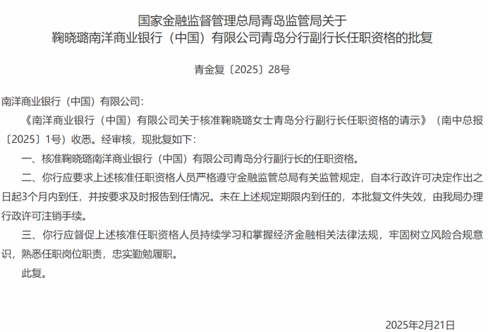 2月27日,国家金融监督管理总局青岛监管局官网公示,经审核,核准鞠晓璐南洋商业银行(中国)有限公司青岛分行副行长的任职资格。批复时间2025年2月21日。