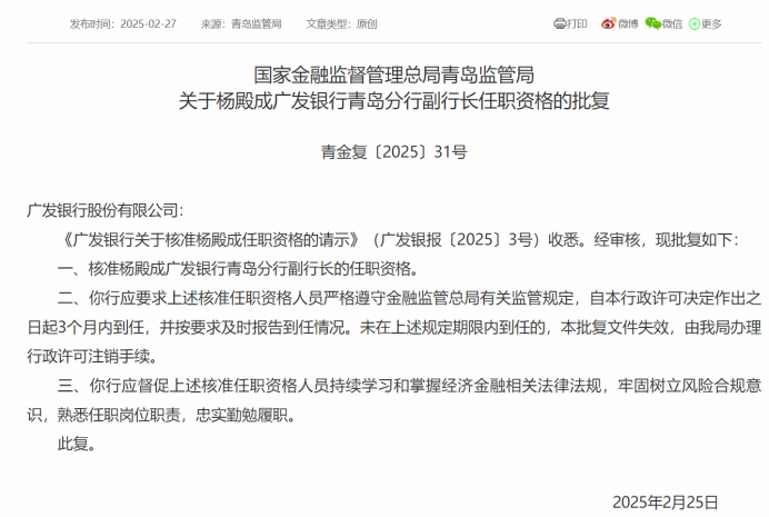 2月27日,国家金融监督管理总局青岛监管局官网公示,经审核,核准杨殿成广发银行青岛分行副行长的任职资格。批复时间2025年2月25日。