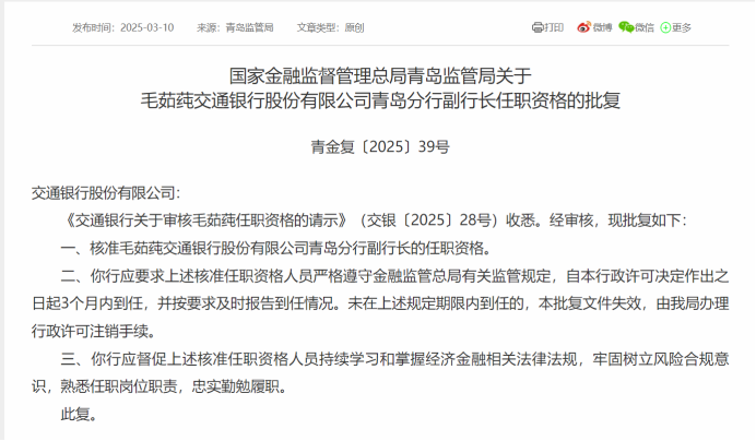 3月10日,国家金融监督管理总局青岛监管局官网公示,经审核,核准毛茹莼交通银行股份有限公司青岛分行副行长的任职资格。批复时间是2025年3月6日。