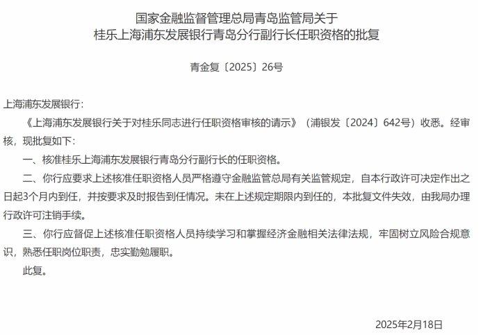 2月21日,国家金融监督管理总局青岛监管局官网公示,经审核,核准桂乐上海浦东发展银行青岛分行副行长的任职资格。批复时间2025年2月18日。