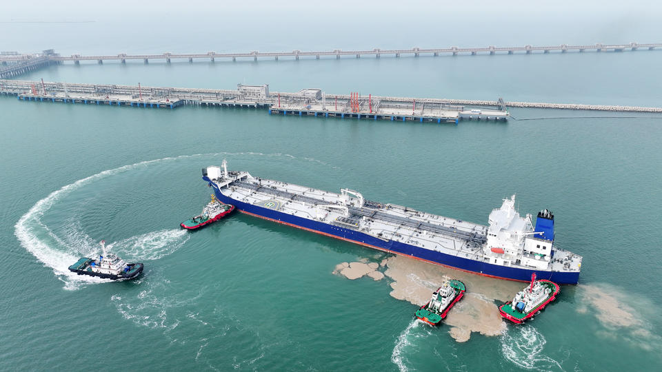 站在东营港一突堤北侧,旁边一艘10万吨级的外籍油轮正在海欣港务码头上通过管线卸油。滚滚的原油从轮船上通过管廊直达罐区和生产企业。抬头远眺,港池外浑浊的海水随风涌动,港池内清澈安静的水面上一艘艘油轮穿梭而过。5万吨、10万吨的码头在港池北侧一字排开,像一根长长的臂膀,从海岸线向着渤海深处伸展,勾勒出沿黄达海的壮阔图景