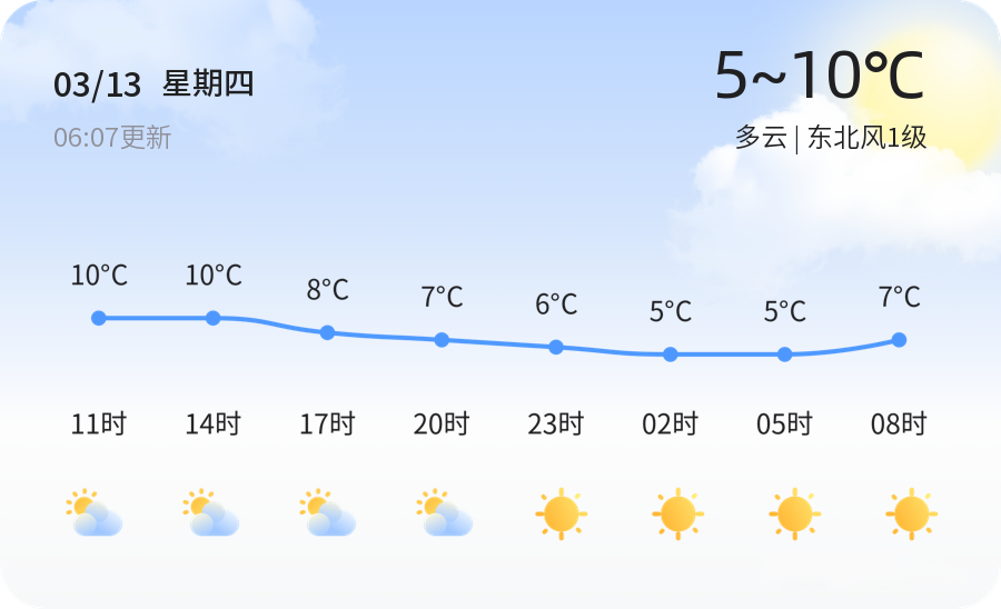 【日照讯】3月13日,农历二月十四,日照市天气以多云为主,气温在5℃至10℃之间徘徊,东北风1级,空气湿度61%,空气质量达到良好级别(PM2.5浓度为68微克/立方米),对市民出行影响不大。但早晚温差较大,建议市民穿着保暖外套,携带雨具以防不时之需,同时注意适时增减衣物,避免感冒。
