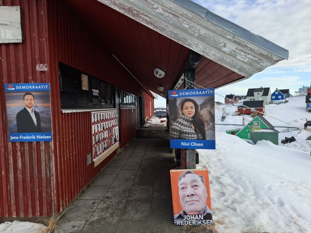 3月11日,丹麦自治领土格陵兰岛亚细亚特的街头悬挂着候选人竞选海报。新华社发(张全卫摄)