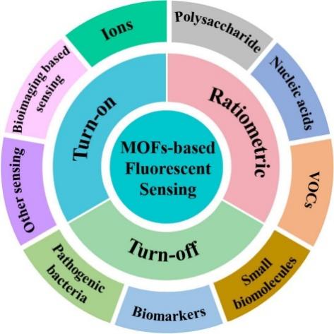 在综述中,作者阐述了MOFs荧光传感的可能机制,分为开启型、关闭型和比率型。此外,作者还对MOFs材料在荧光传感应用中的最新进展进行了分类介绍。因此,本综述将为基于MOFs的荧光传感在各种应用中的设计提供一些一般性指导原则,同时作者也对基于MOFs的荧光传感面临的挑战和前景进行了展望。