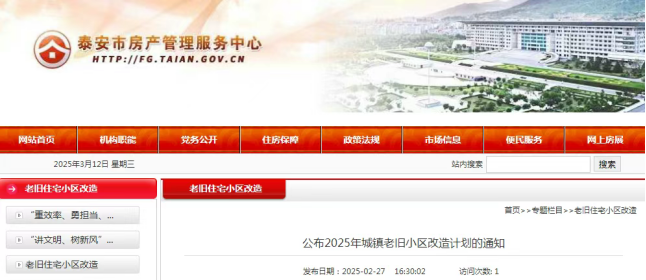 近日,泰安市房产管理服务中心网站发布《公布2025年城镇老旧小区改造计划的通知》: