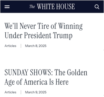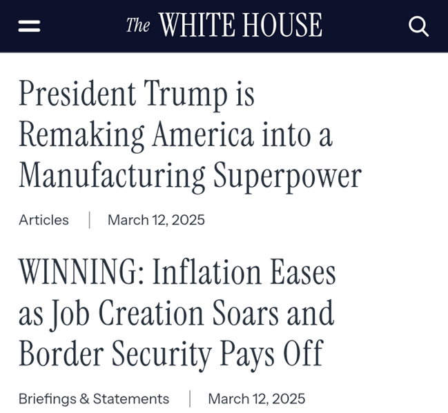 就在前一天,白宫官网依旧高调宣称:“在特朗普总统的领导下,我们永远不会厌倦胜利。” 3月9日当天更是进一步升温,直接宣布:“美国的黄金时代已经到来。”