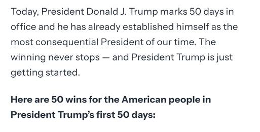 一篇宣称“特朗普总统的关税措施已开始发挥作用,越来越多的公司考虑‘扩大其在美国的业务或在美国开设工厂’”。另一篇的风格则更为夸张,直接将特朗普誉为“我们这个时代最具影响力的总统”,并以激昂的口吻总结了特朗普上任五十天取得的五十项胜利,称“胜利永无止境”。