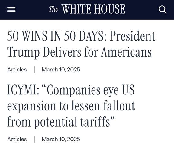 3月10日,因市场担忧美国关税政策和裁员政策将引发的经济衰退,美股暴跌的同时,白宫放出了两篇报道。