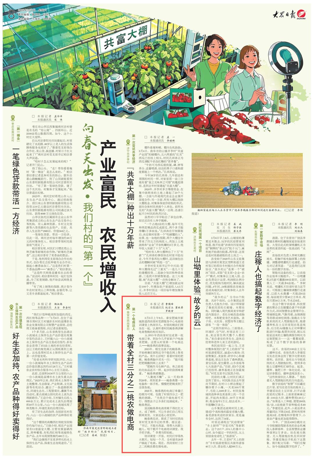 3月8日,8版“向春天出发▪我们村的第一个”专题报道,刊发全省16市16个村的这些“第一个”,讲述山东乡村振兴故事:泰安肥城市新城街道西尚里村第一个电商达人:带着全村三分之二桃农做电商。详情点击这里——《产业富民 农民增收入》